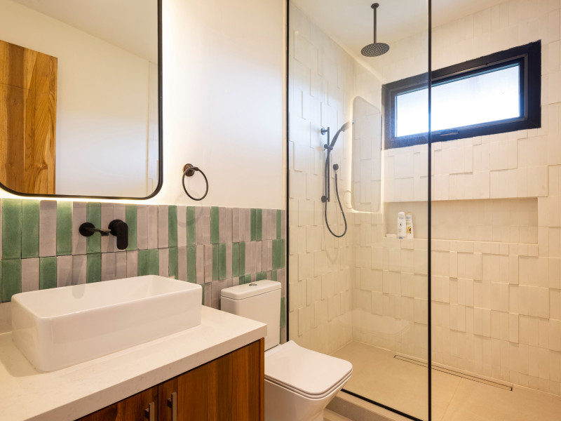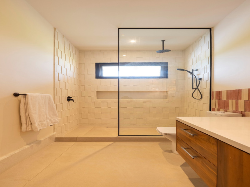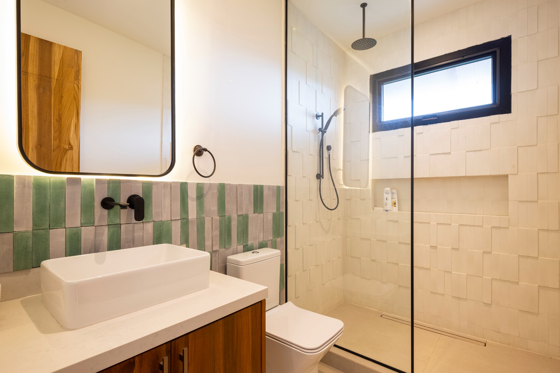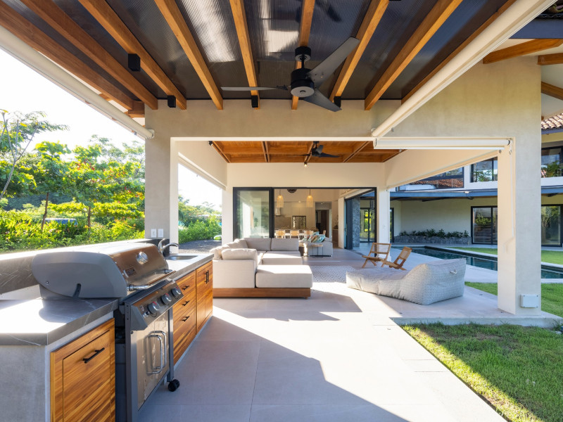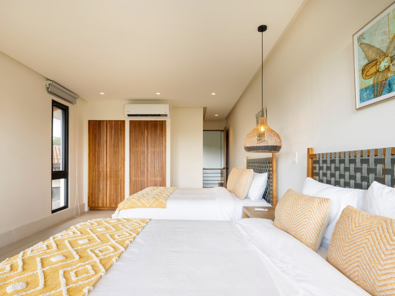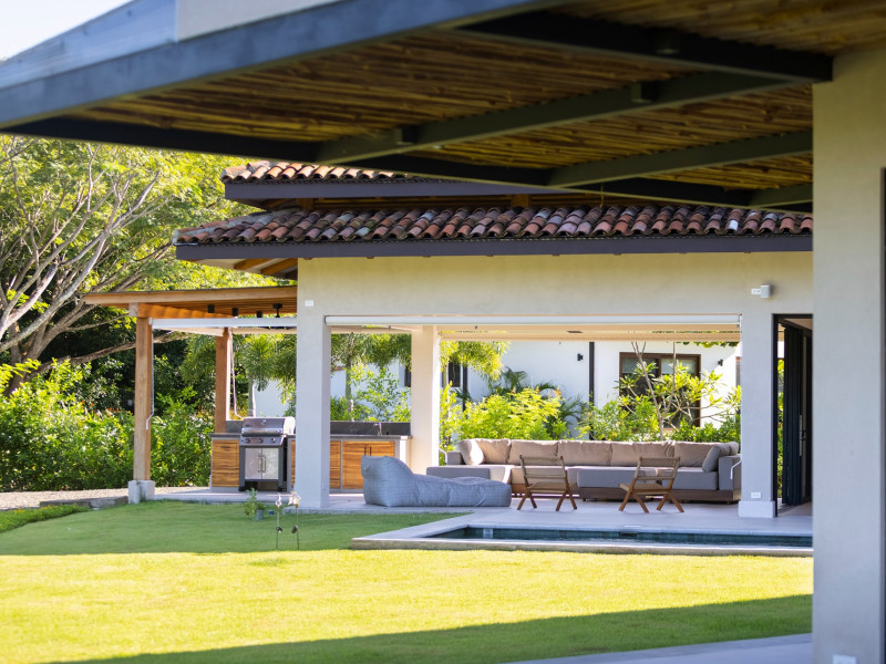 Les espaces extérieurs offrent une véritable ambiance de resort privé. Une piscine en pierre Sukabumi constitue le point central du jardin, complétée par un terrain de beach padel récemment aménagé et un espace de volleyball sur sable. Une végétation tropicale mature garantit intimité et tranquillité. Un sentier privé permet d’accéder en trois minutes à pied au rivage paisible de Playa Bonita.