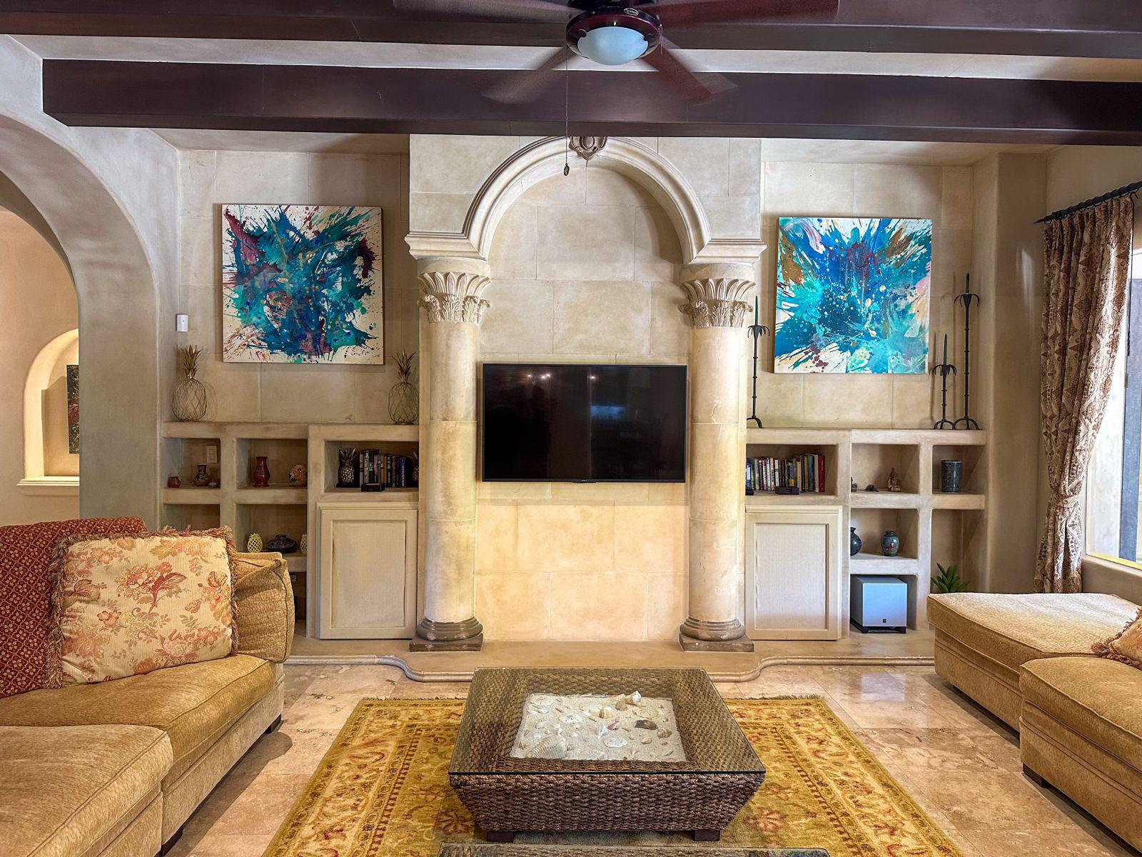From the moment you enter, the home reveals a sense of architectural distinction and timeless character. The grand main living area showcases exposed wooden beams, artisan-crafted details, graceful archways, and custom finishes that create warmth and elegance throughout. The thoughtfully designed layout flows naturally between formal and informal spaces, offering intimate sitting areas and open gathering rooms framed by views of the garden and private pool.